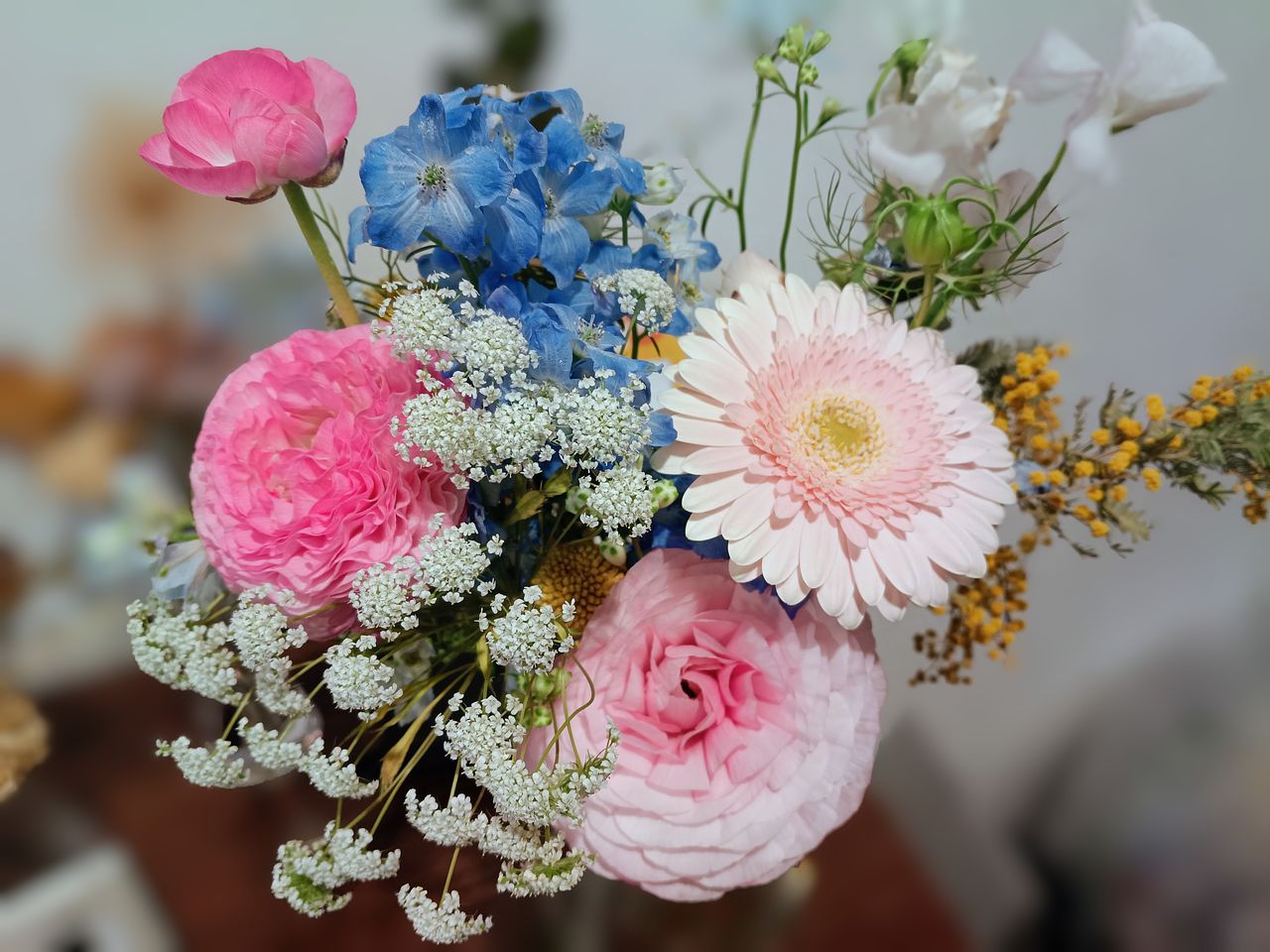 ガーベラ、ラナンキュラス、スィートピー、デルフィニウム、ニゲラ、レースフラワー、ユーカリが入った可憐なイメージのブーケで気に入りました。色合いもピンクとブルーで写真のイメージ通りでした。