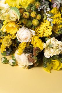 姿形さまざまな黄色の花とミモザの組み合わせはお家を華やかな空間に✨