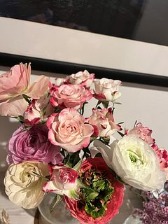 - ボリュームはラナンキュラスとバラ(スプレーバラ)を8〜9本ほどお届け。