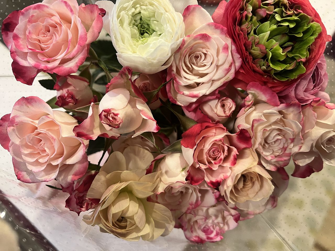 甘いピーチミルクのようなカラーリングのラナンキュラス中心にバラを添えて贅沢に束ねました🍑🐮