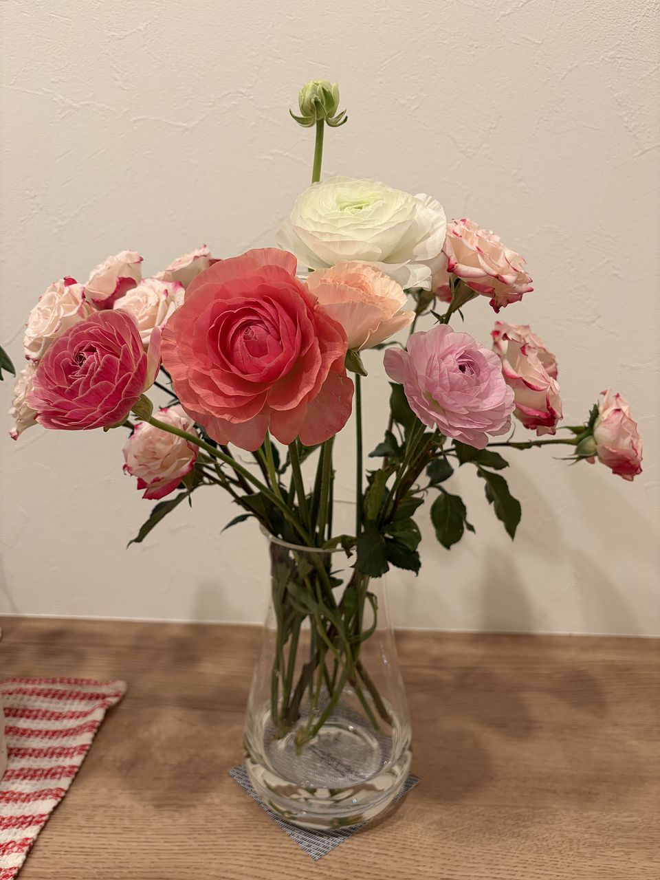 ラナンキュラスは小ぶりのバラ2本のボリュームに比べると茎も細くてあまりに弱々しく、少々がっかりしました。 この後花が徐々に開いてくるのを期待します。