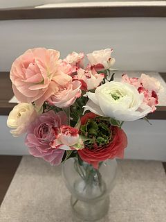 とても可愛い色合いで空間がふわっと明るくなる感じです。少しずつ茎を短くしたり、分けて飾ったりしながら長く楽しむことが出来ました。1番大輪のラナンキュラスは2週間以上飾っていました♪