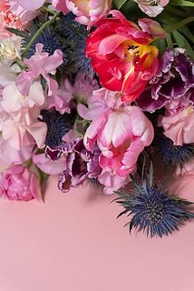 色々なトーンの春のピンクお花に、ほんのり光沢感のあるブルーのエリンジウムがアクセント🎀🦩🫐
