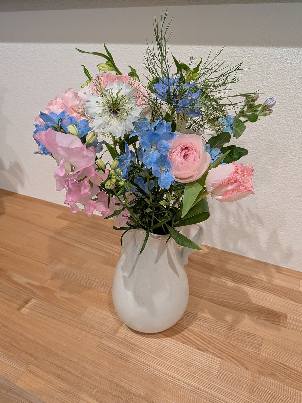 とても素敵なブーケでした! 白、ブルー、ピンクの花たちが華やかで爽やか! ありがとうございます!