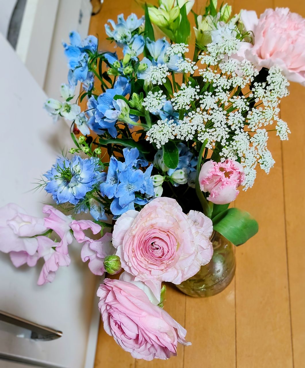 たくさん(10種類?)の花が入っていました バラ、ラナンキュラス、アルストロメリア、スイートピー、サクラ、デルフィニウム、レースフラワー、ニゲラ白と青、ブルースター ボリュームがあります