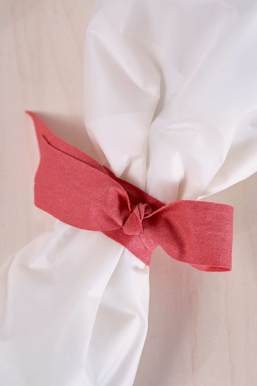 ラズベリーカラーのリボンを巻いてお届け。