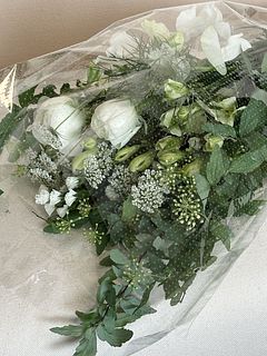 ホワイトカラーのラナンキュラスやスイートピーがまるで白鳥が優雅に舞っているよう🦢