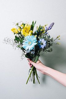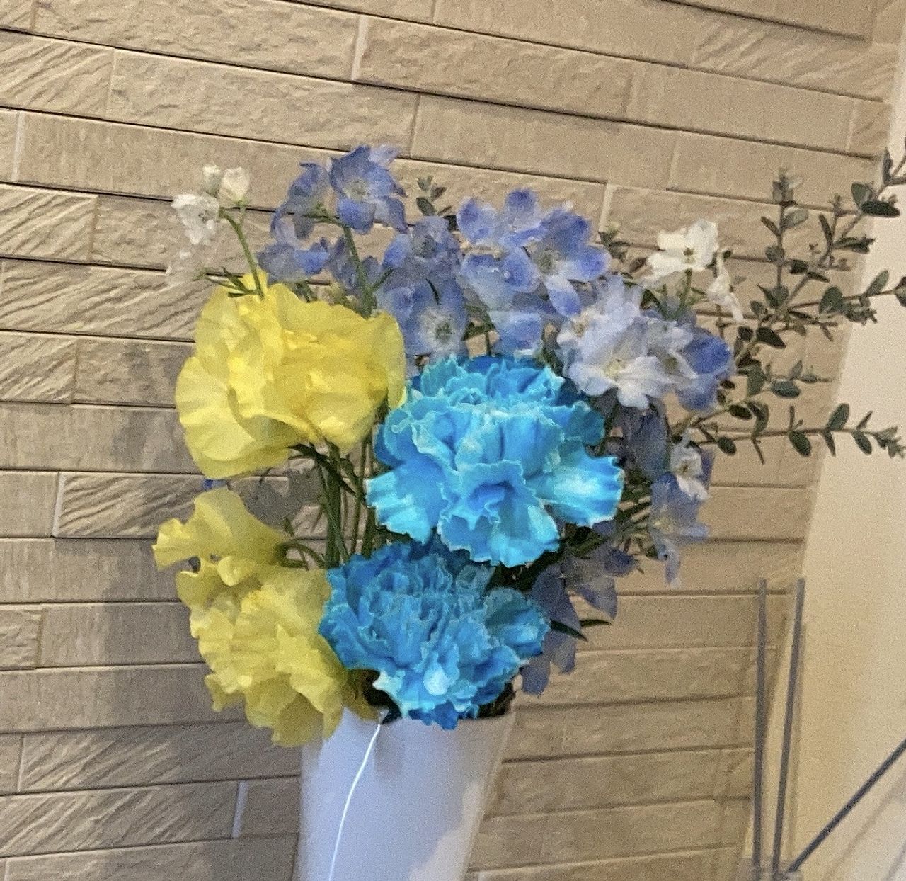 あざやかな空色とレモンイエローを組み合わせたブーケ🍋 アスチルベは「スカイブルー」、ハイブリッドスターチスは「キノレモン」という品種。