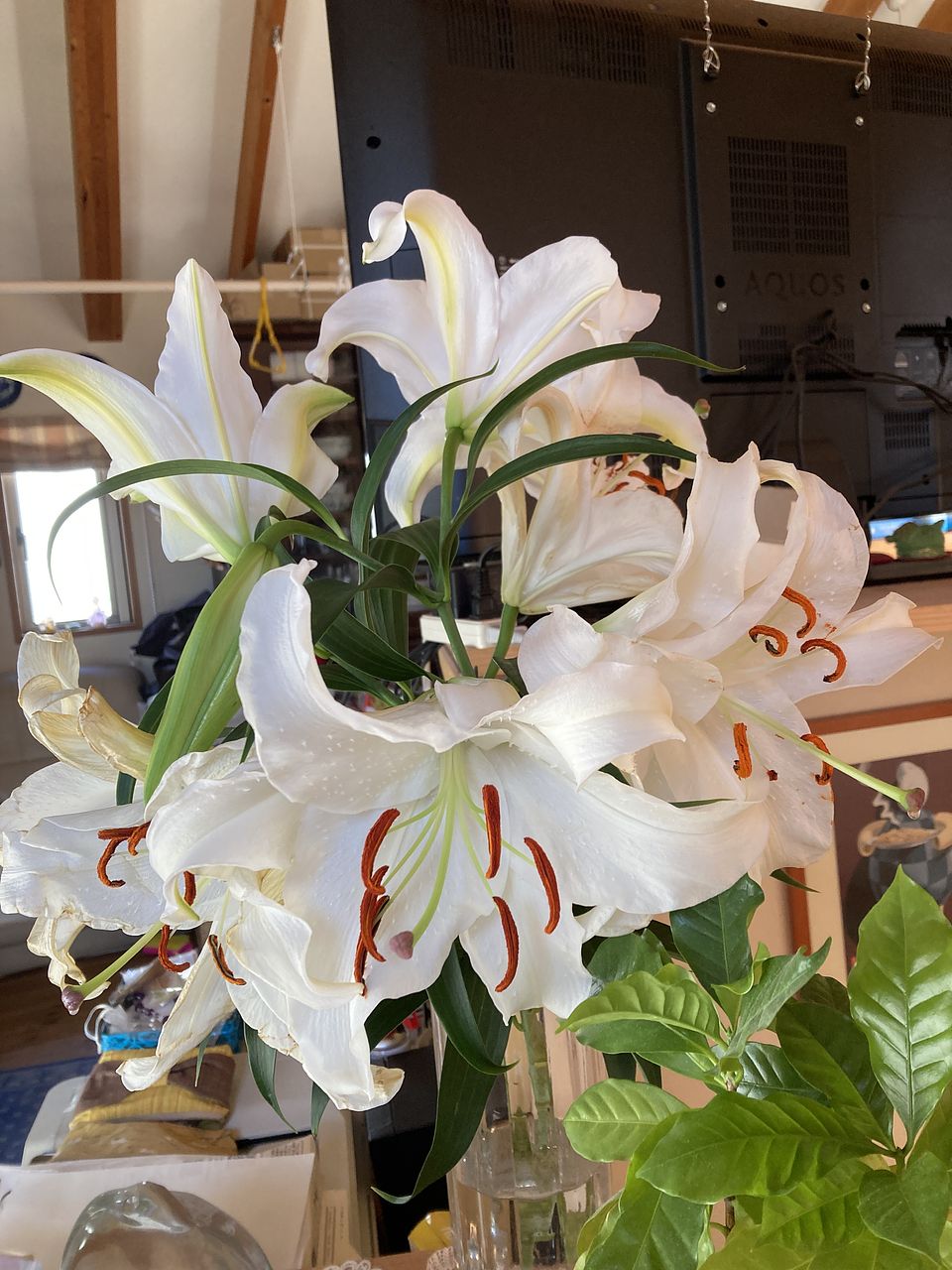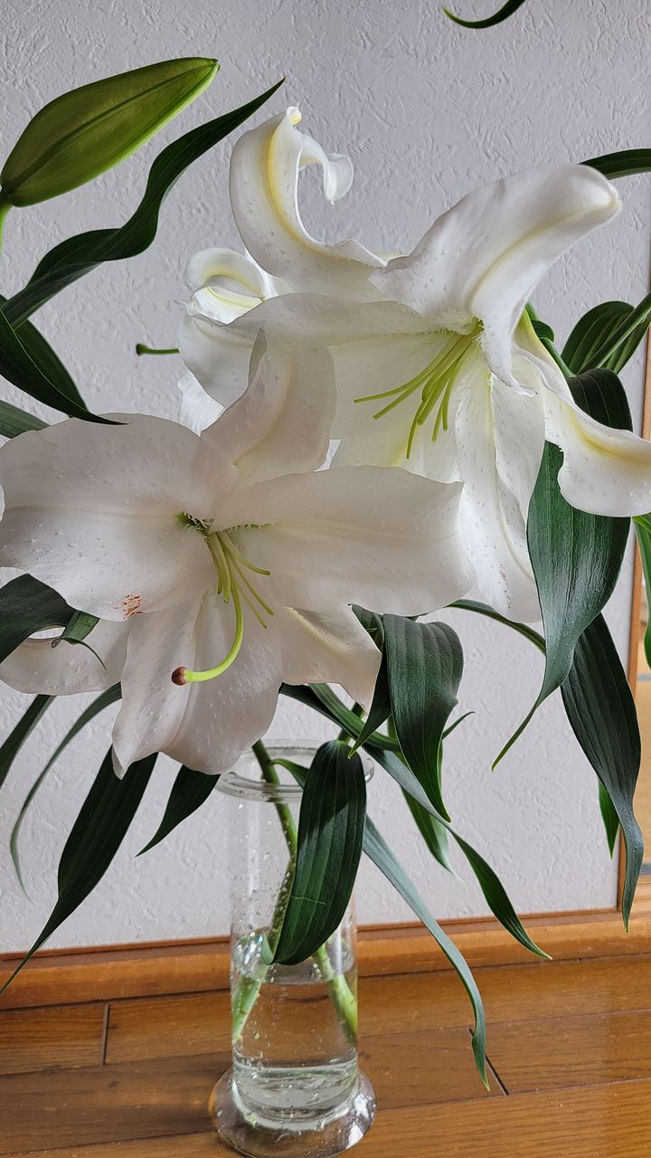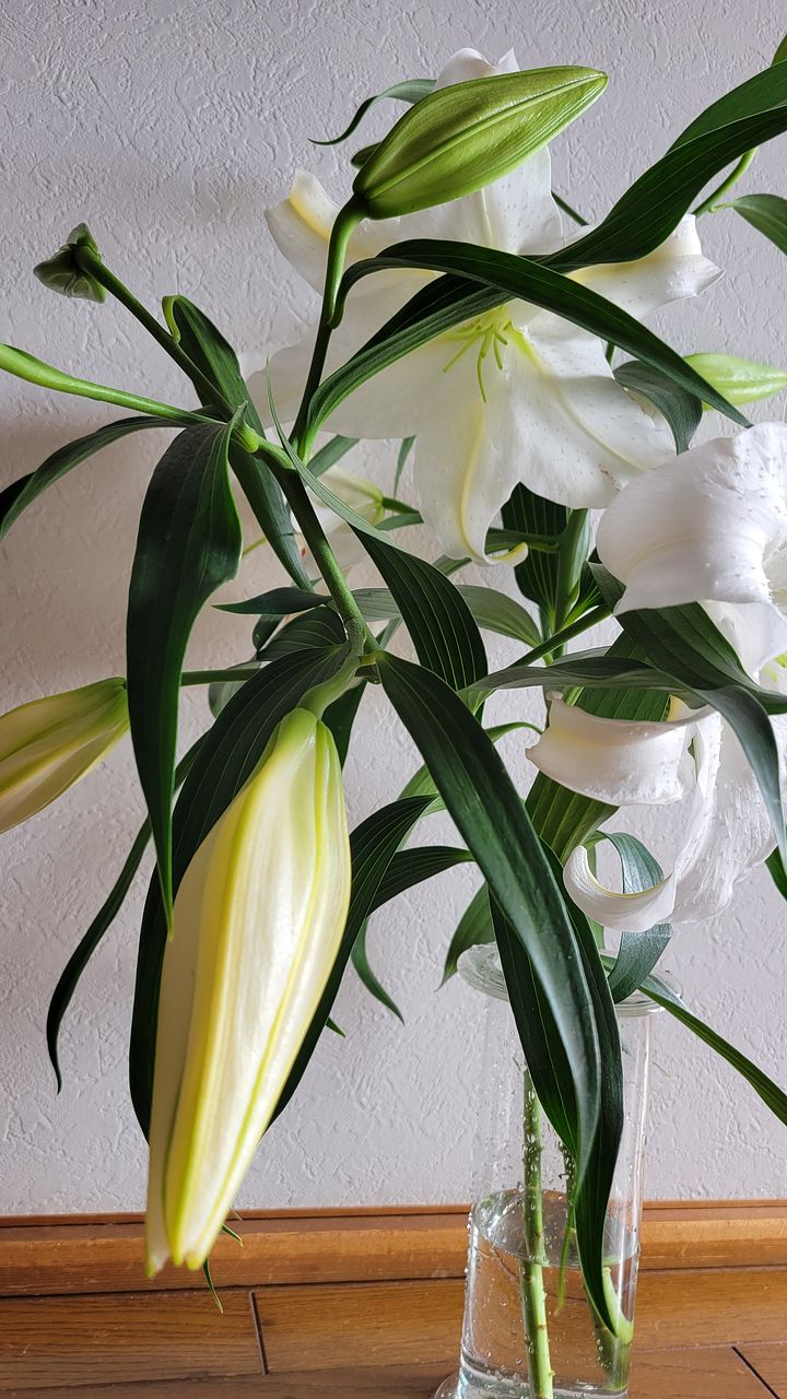 蕾が5つついたものが2本届きました。 カサブランカとしてはやや小ぶりな蕾ですが、咲いたら十分な存在感です。 急に暑くなったのでトイレに飾るお花に困っていたのですが、暑さに強い百合なら安心です。 1本ずつ各階のトイレに飾りました。 真っ白で大輪(今回はやや小ぶり)のカサブランカ。 百合の中でいちばん好きです。