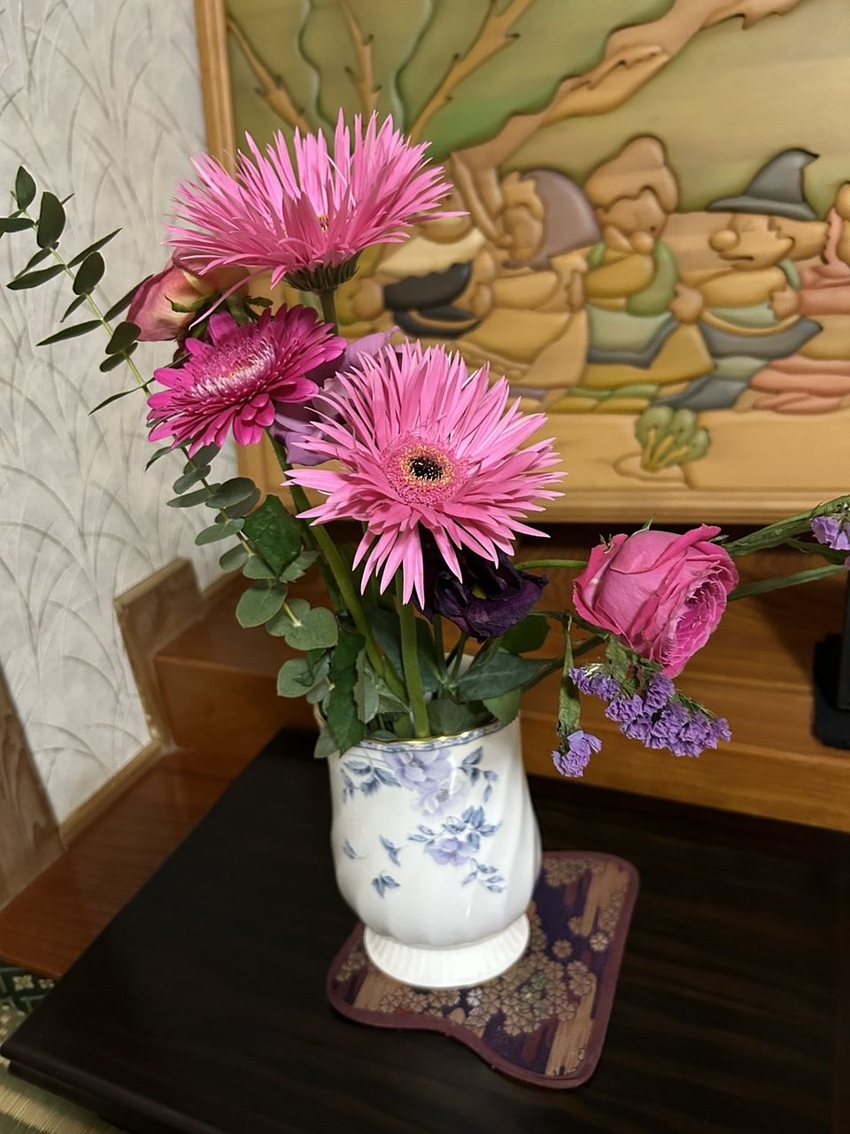 写真よりはボリューム少なめでしたが、ビビッとピンクのお花達がお部屋を華やかにしてくれました。 2束のセットは、これからもお願いしたいです。