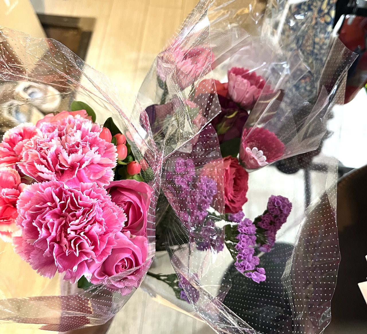 2束分のボリュームで、ひとつ大きなブーケをもらった気分になります。様々なピンク色がとても綺麗で、見惚れてしまいます。