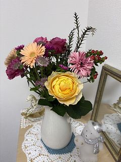 想像よりボリュームのあるお花たちでした!。 カラートーンの異なるタイプがMIXされていて、普段は選ばないお花がお部屋を鮮やかにしてくれました。ミルクピンクはブーケ風に、ベリーの方は小さくまとめてみました。