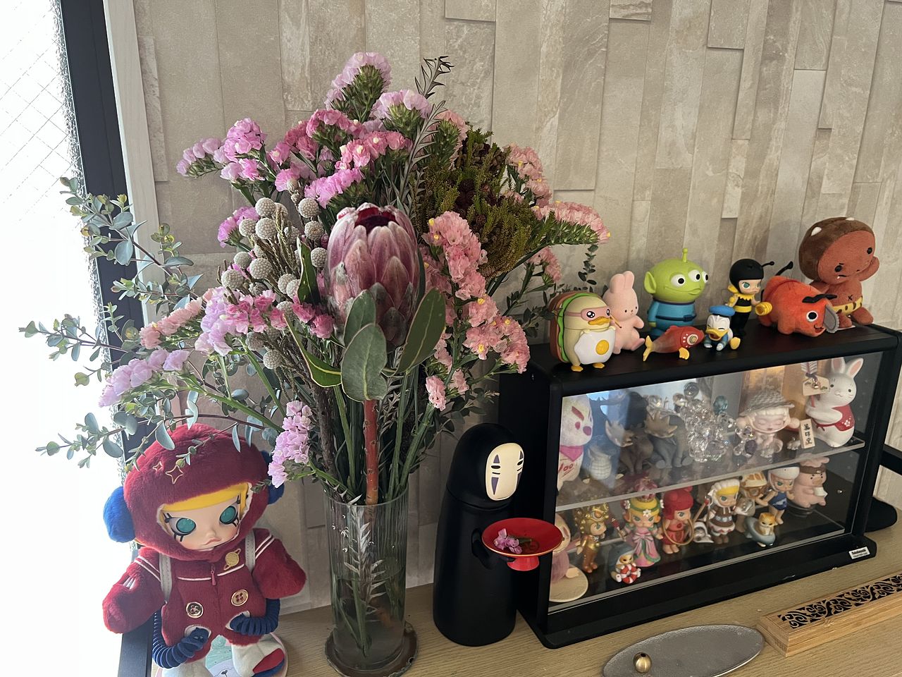 プロテアをメインにふわふわとピンクカラーがかわいいスターチスをたっぷりと添えて😍