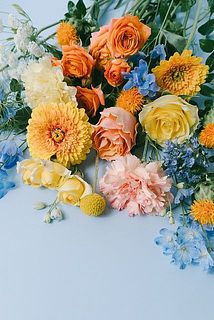 清涼感のあるブルーとジューシーなビタミンカラーのお花を組み合わせたおまかせブーケ🍋🍊
