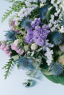 ラベンダー色のスターチスとやわらかなユーカリが