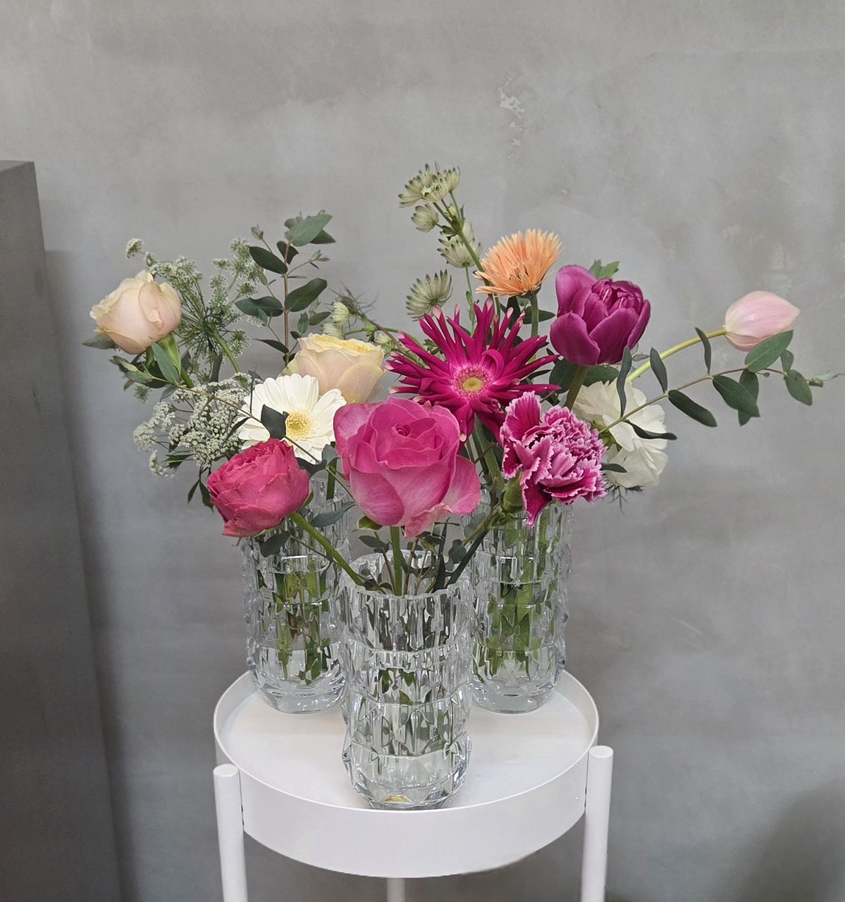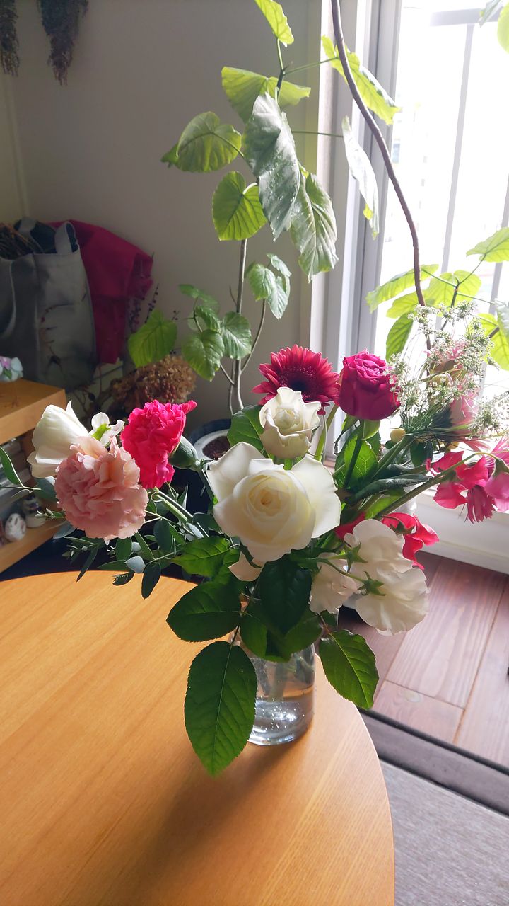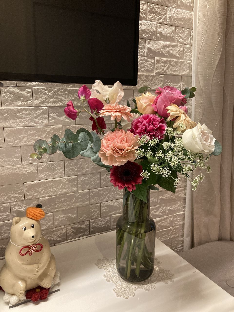 大きな花瓶にまとめて飾りました! 思った通りのボリュームでみんなかわいいです。 flowerのお花たちはしっかり水揚げをしてあげると、とても長く咲いていてくれるので楽しみです。
