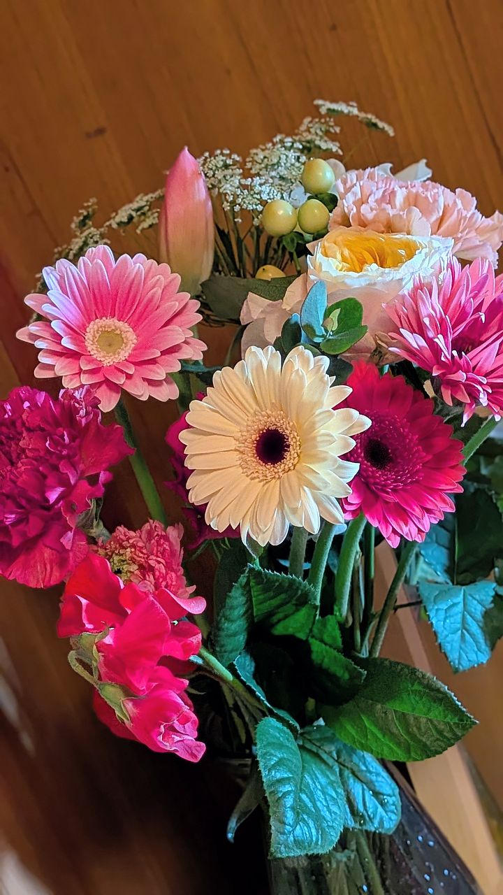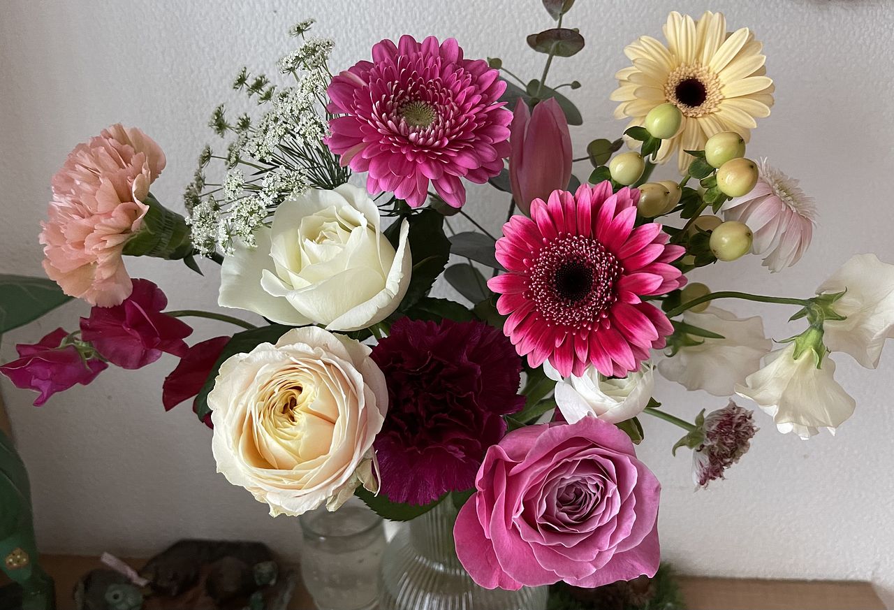 素敵な色合い、組み合わせの花束が届きました。 1束では少し寂しいので、2束一緒に花瓶に入れます。