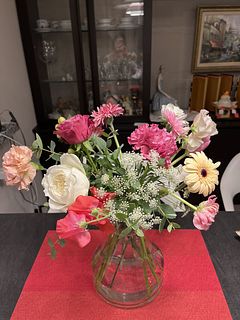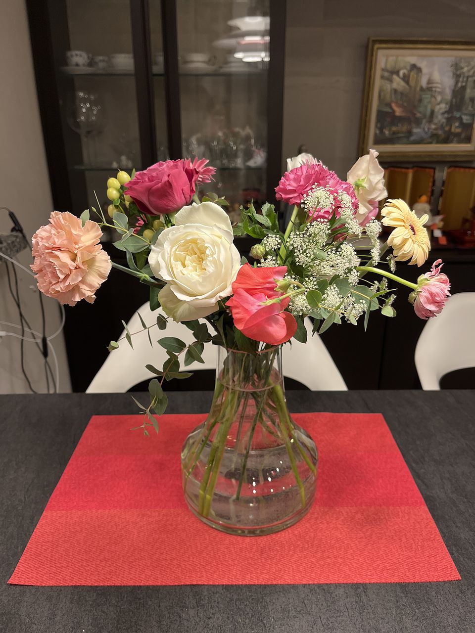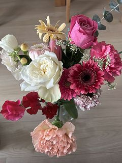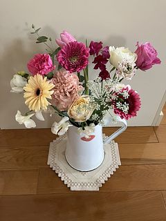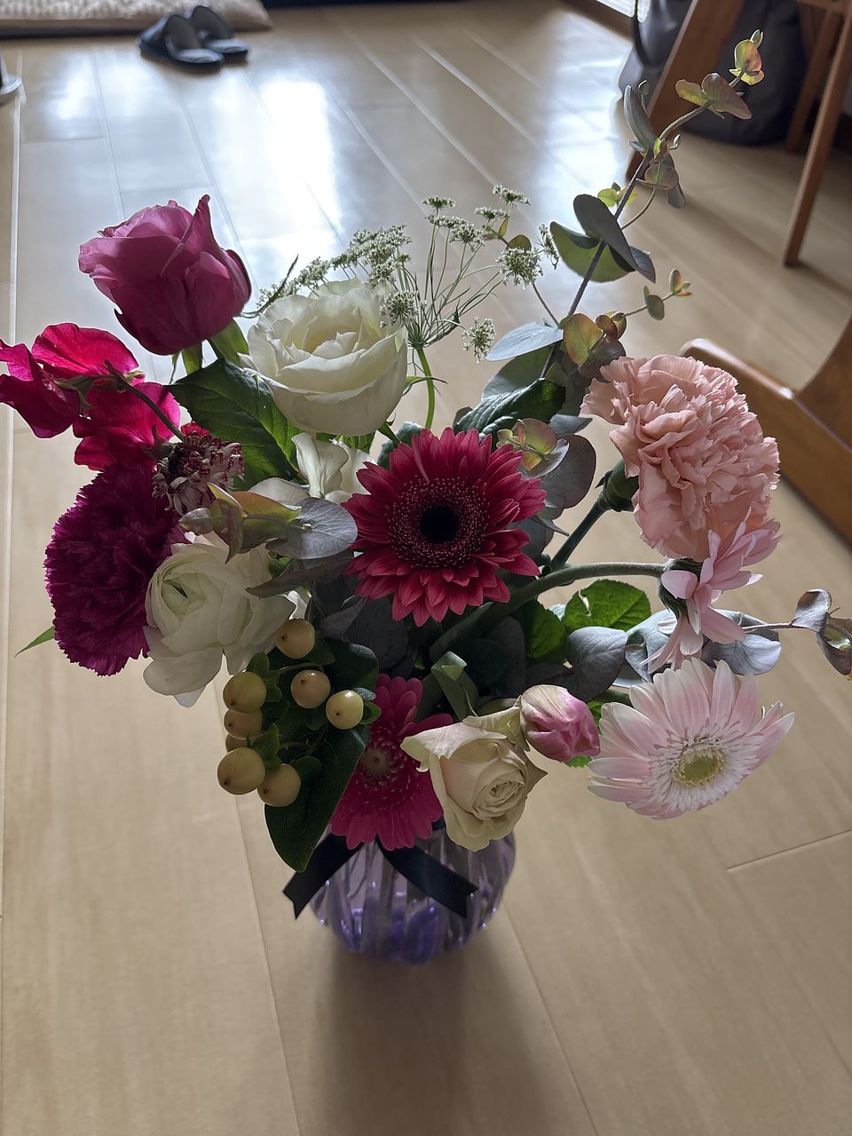 ベリーの花束と,ミルクの花束素敵でした。 ただ,花瓶一個にまとめると豪華ですが色のバランスが難しい。花瓶2個の方がいいかなぁ? あとカーネーションが一本花の近くで折れていました。 生花の配送って難しいですね。とりあえず,古い花と一緒に低い瓶に生けておきました。