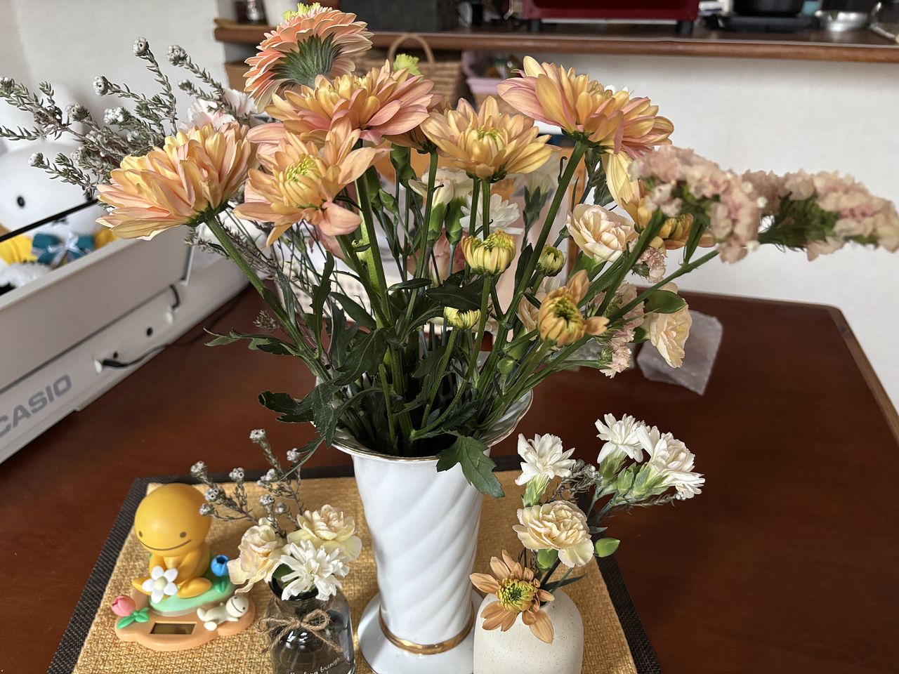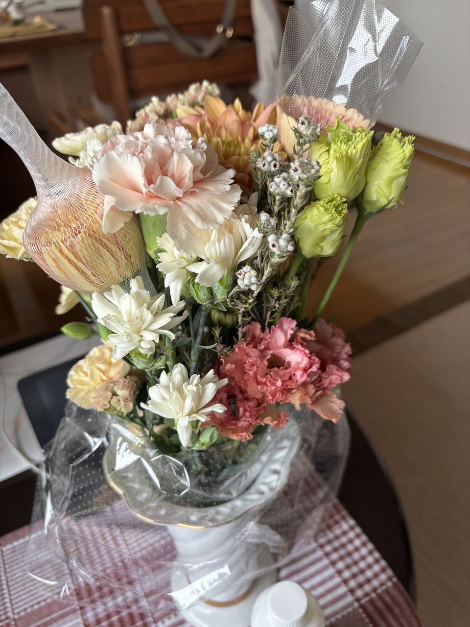 花もちの良さで人気のマム(菊)やカーネーションがメインなので、見た目だけでなく、長く楽しめるのもポイント🧡
