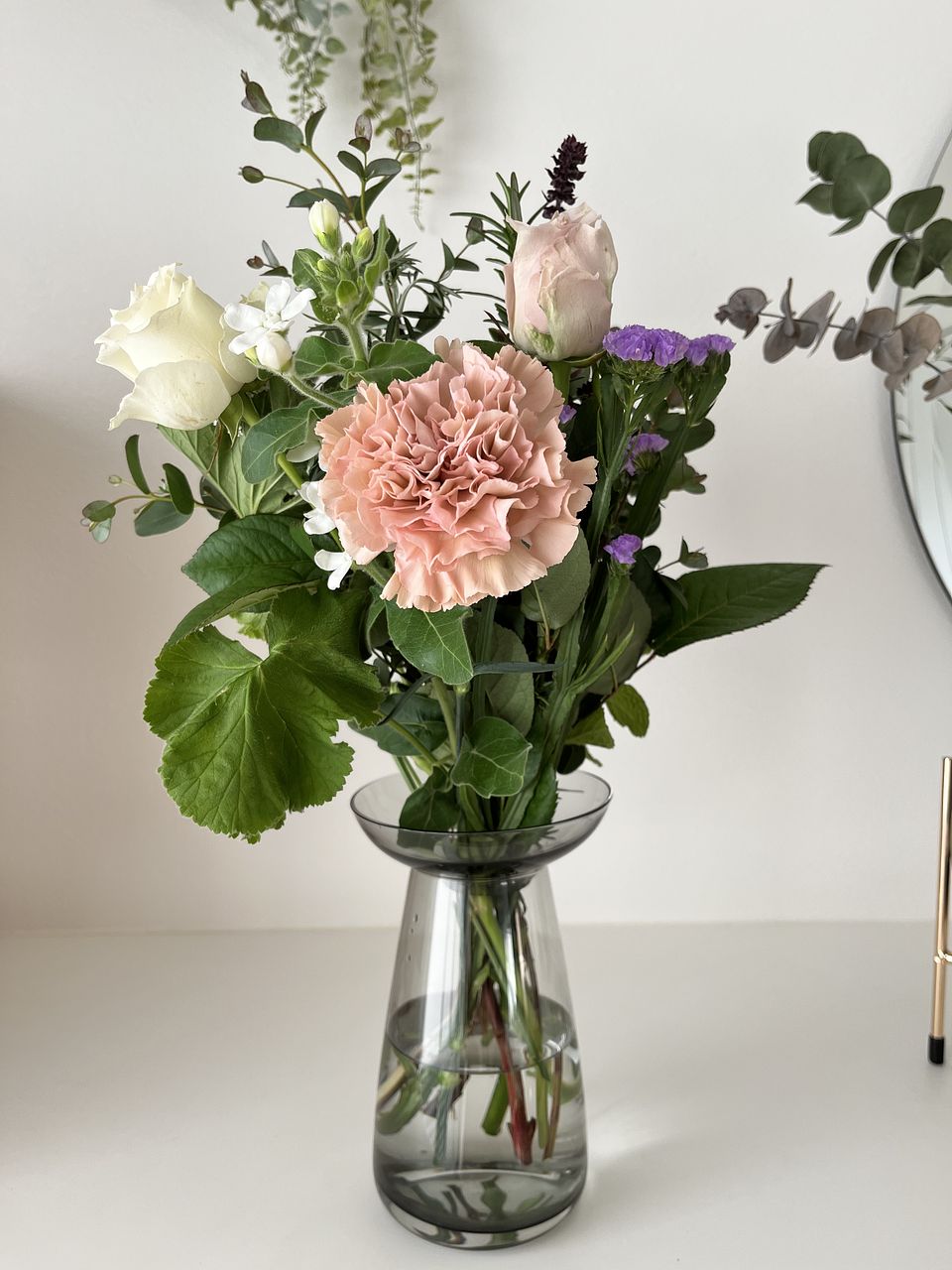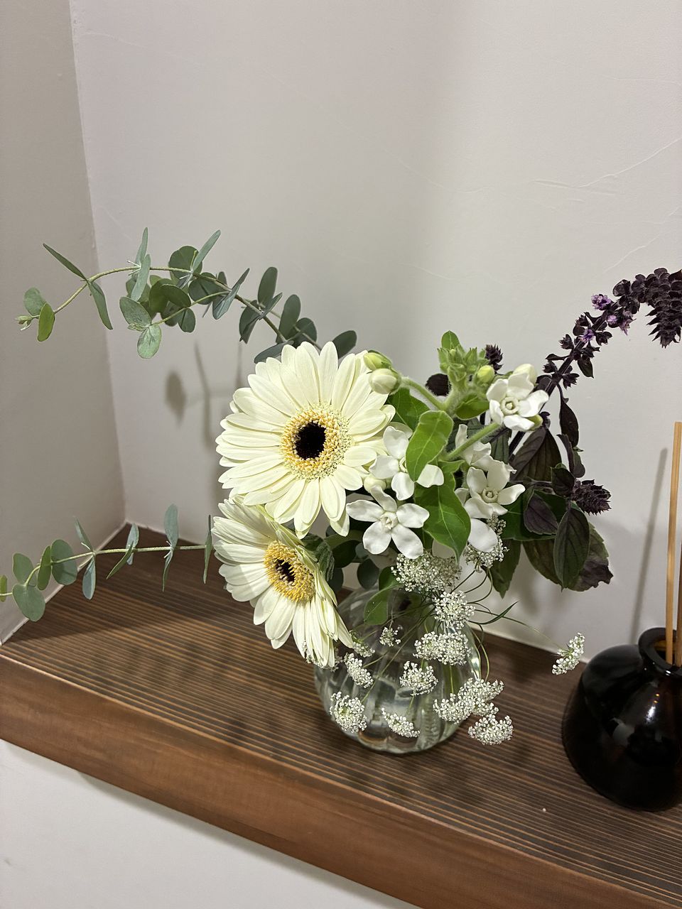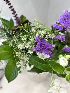 初利用でした!総じて満足しております❣️ ▼2025/11/8受け取り(常温便):宅急便屋さんから箱を受け取った瞬間からハーブのいい香り🌿 10本程度入っていて、長いのを切り分けて13本程度のブーケに仕上がりました。ブルースターに白い付着物がついており驚いて問い合わせたら樹液が出ることを回答くださり、安心して除去。 花器は一緒に注文したドロップベースを使用🍷 本日10日経過しましたが全員元気!香りは5日くらいで落ち着きました。 ▼届いたブーケのレシピ💐(推測):カーネーション/スターチス/レースフラワー/バラ/ホワイトスター/ユーカリ/ゼラニウム/ブプレリウム/バジル/ローズマリー/ミント