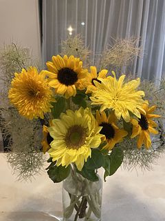 太陽のようなひまわりと、もくもく雲のようなスモークツリーのコラボレーション🌻☁️