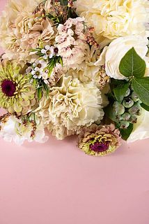 ベージュやクリーム、スモーキーピンク、淡いグリーンといったトーンでまとめられたお花たちが、やさしく上品な印象を醸し出します。
