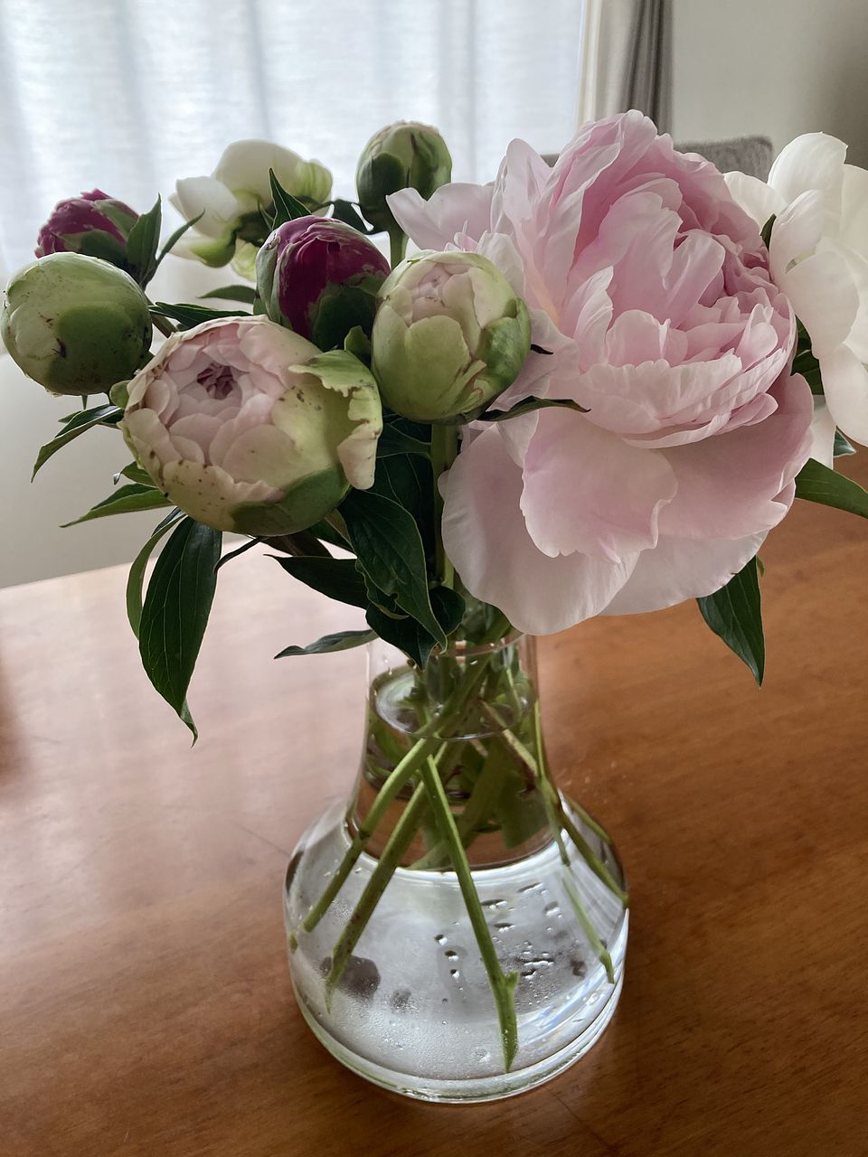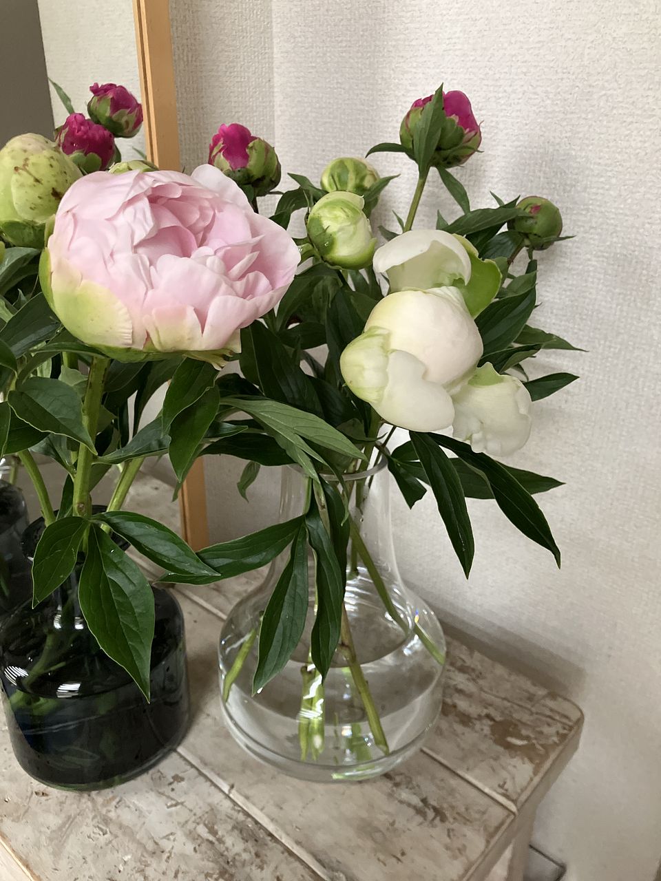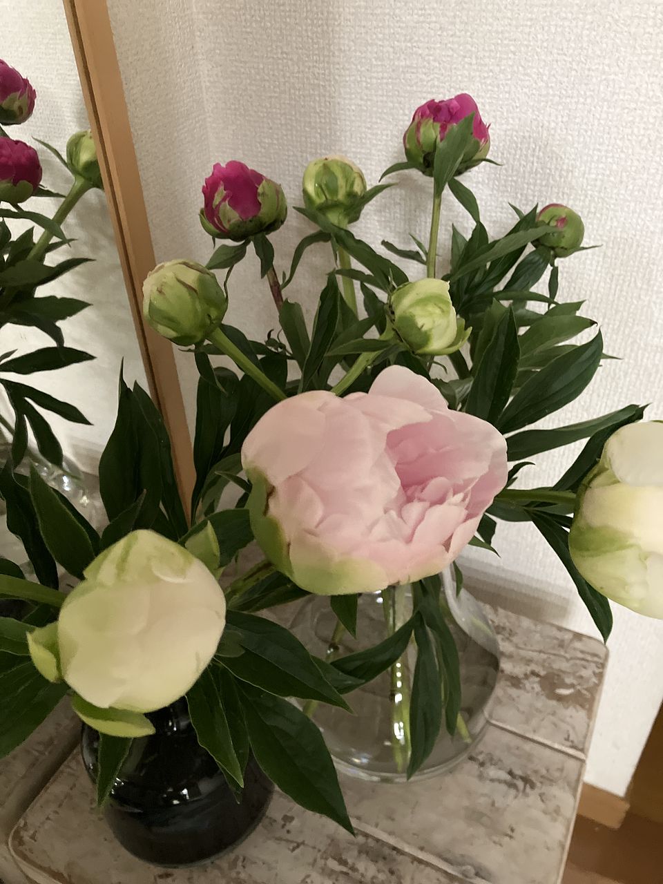 満開している白いピオニー一本は咲いてから届きました!次々と咲いていて、3本はまだつぼみですが、段々柔らかくなって来ました。とてもボリュームあり、3色混ざっていてゴージャスです。