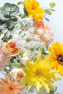みんな大好き🌻ひまわりを主役にクリーミーなイエローからコーラルのお花をたっぷり組み合わせて🐥🌼