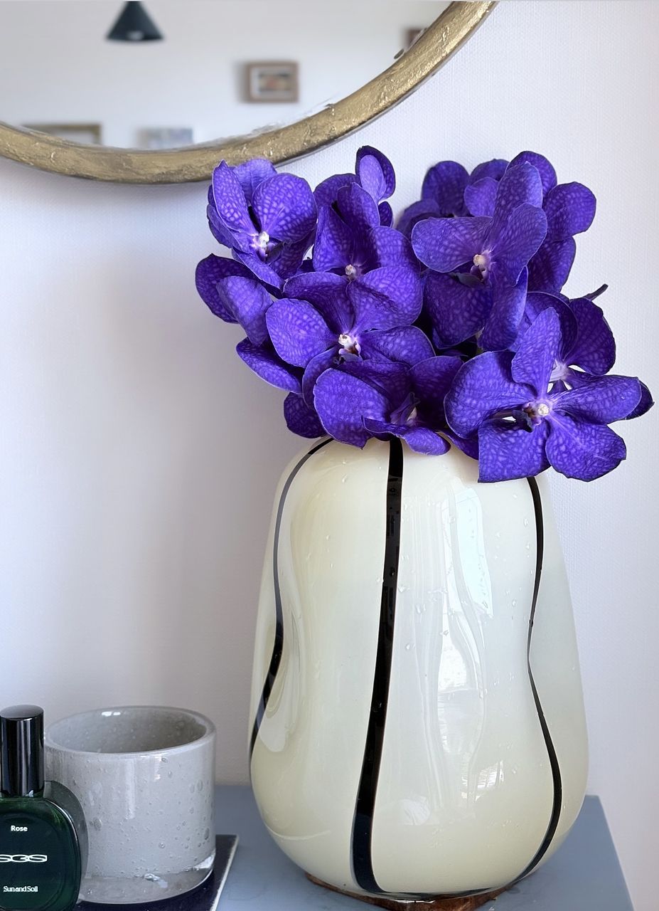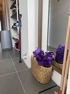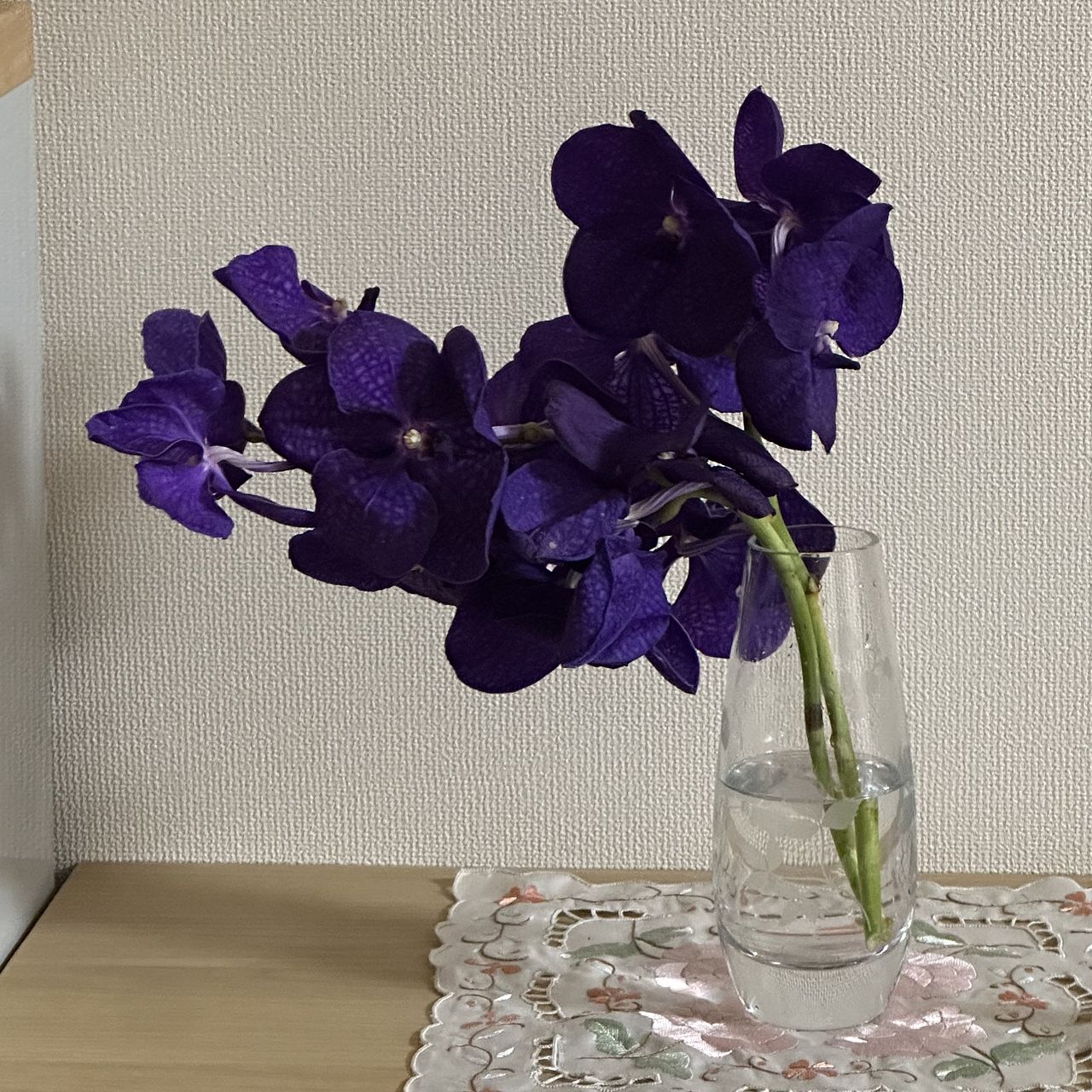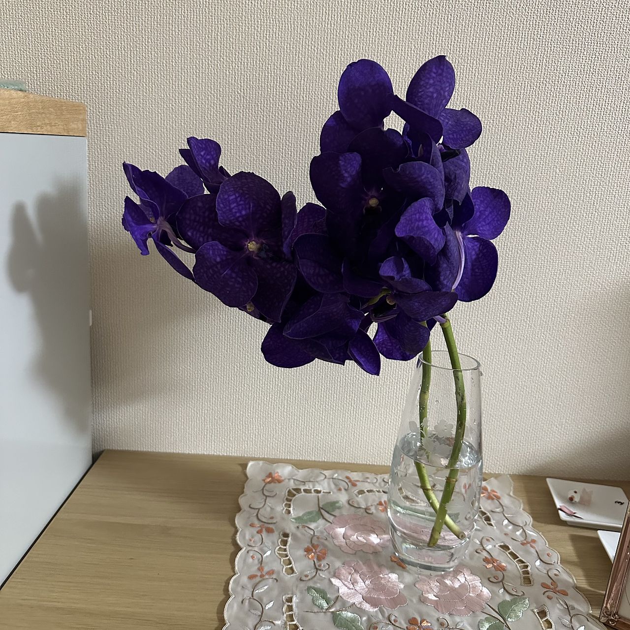 パキッとした鮮やかな紫がアクセントになります。でも花器をどうしたらいいか悩みました。手持ちのものでは浅水だと茎が届かない苦笑 もう少し長めだとありがたいですね。