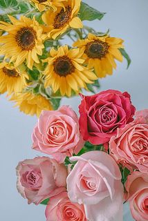 ピンクのバラの花言葉は「感謝」「幸福」。ひまわりの花言葉は「憧れ」「元気」。