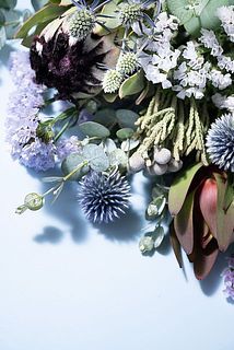 ラベンダー色のスターチスとやわらかなユーカリが甘すぎず、上品で落ち着いた雰囲気を演出しています。