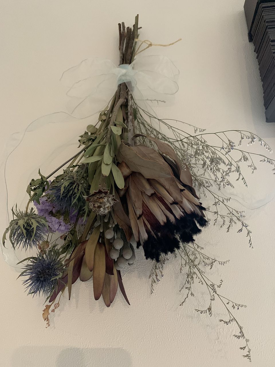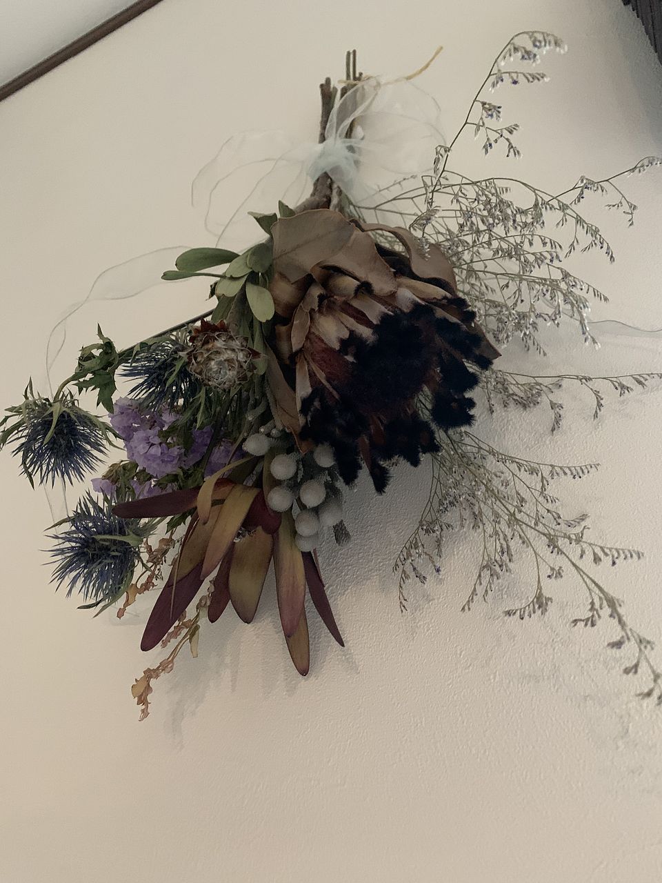 ブルーベリーのような深い青をアクセントに、ふんわり優しい紫や白のスターチス、爽やかなグリーンを合わせた涼しげでみずみずしい印象のナチュラルスワッグです🫐✨