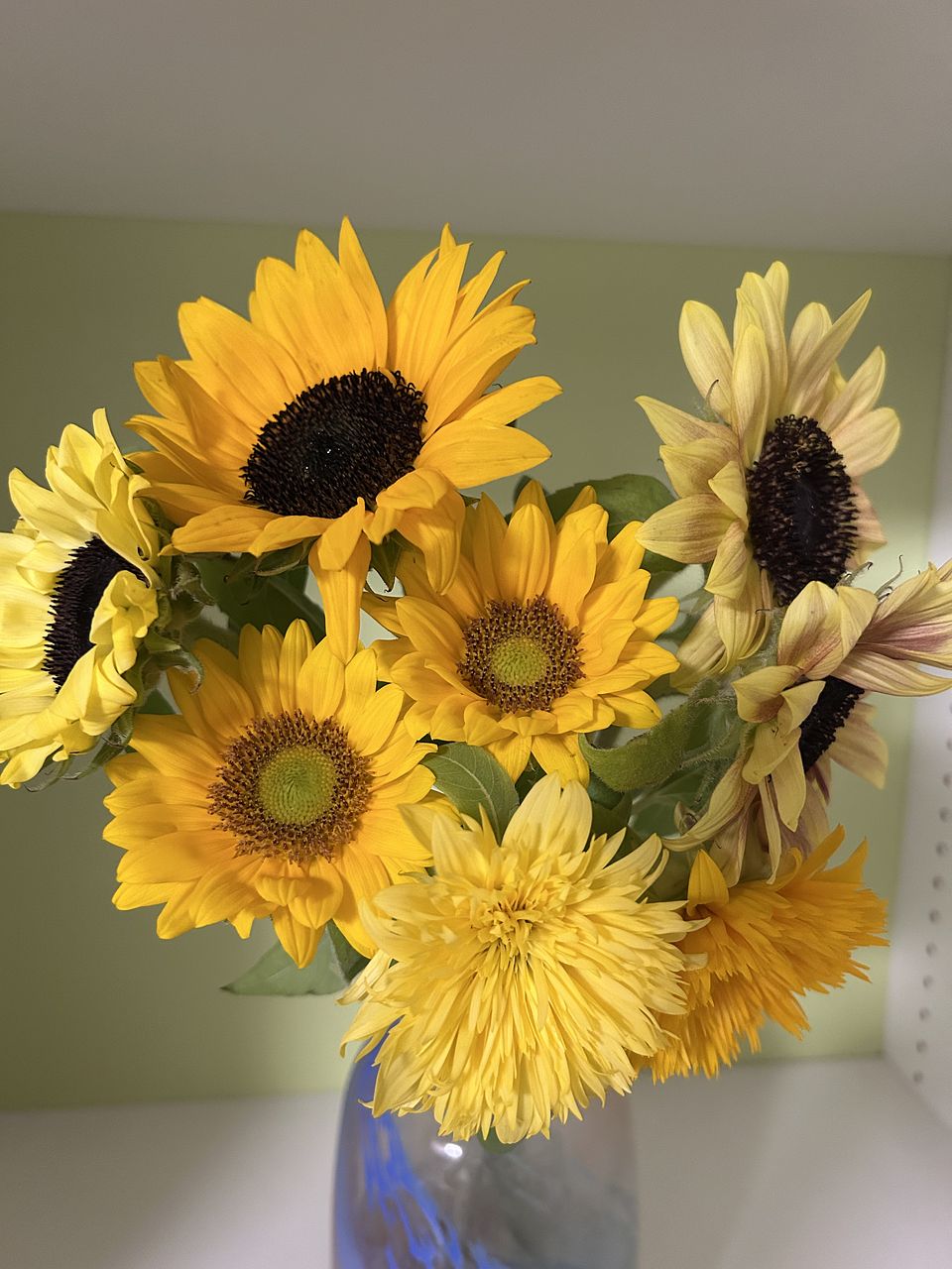 ひまわりにはこんなに様々な種類があることを初めて知りました。それが合わさることで、ブーケがより可愛らしく、角度によって見え方の変化があるところも気に入りました。厳しい暑さで日々うんざりですが、やはりひまわりは夏によく合う、元気を貰えるお花と思いました。