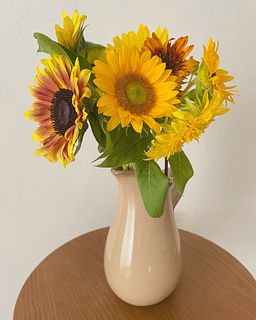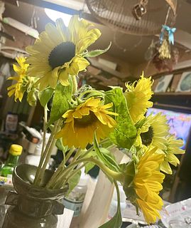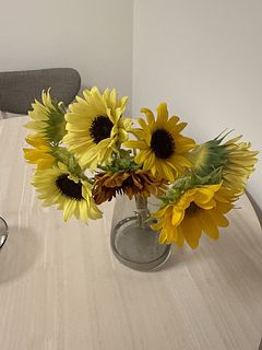 初めてネットのお花屋さんで購入しました。 写真のような色んな種類の大輪のひまわりを期待していましたが届いたのは小ぶりなひまわりが多めの束でした。お花に欠けや枯れてることは無かったですが記載の通りに水揚げしても1本を除いてみんな首が曲がっており下の方をまとめなければバラバラの方向を向いてしまっています🥲 個体差があると言われればそれまでですが、やはり自分で選べないのはかなり難点ですね。価格も安いので仕方がないかという気持ちです。八重咲きのひまわりも混じってたら嬉しかったな、、、