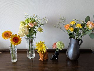 まず茎先をカットし、茎の7〜8割が浸かるイメージで深いお水に数時間つけてあげて。水圧で花に水が届きます。水揚げが完了したら、毎日のお世話は浅水〜中くらいの水量で。水換えはこまめにしてあげましょう。切花の栄養剤を使うと、バクテリアの増加を減らせるのでおすすめです。