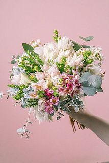 今回は、必ず白いセルリアが入ったおまかせブーケです。色はホワイトグリーンと、ホワイトグリーンに差し色ピンクの2パターンあります。2枚目以降の写真もご確認ください。