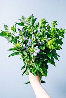淡いブルーの涼しげなリンドウ「パステルベル」と香りのいいマウンテンミントを爽やかに束ねました🌿