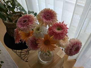 アプリコットピンクやコーラルピンク、ホワイトピンクなどニュアンスカラーのガーベラをギュッと束ねました🍑ころんとした咲き方が最高にキュート🥰 お買い得価格が実現しました🉐 200円ほどお得です。