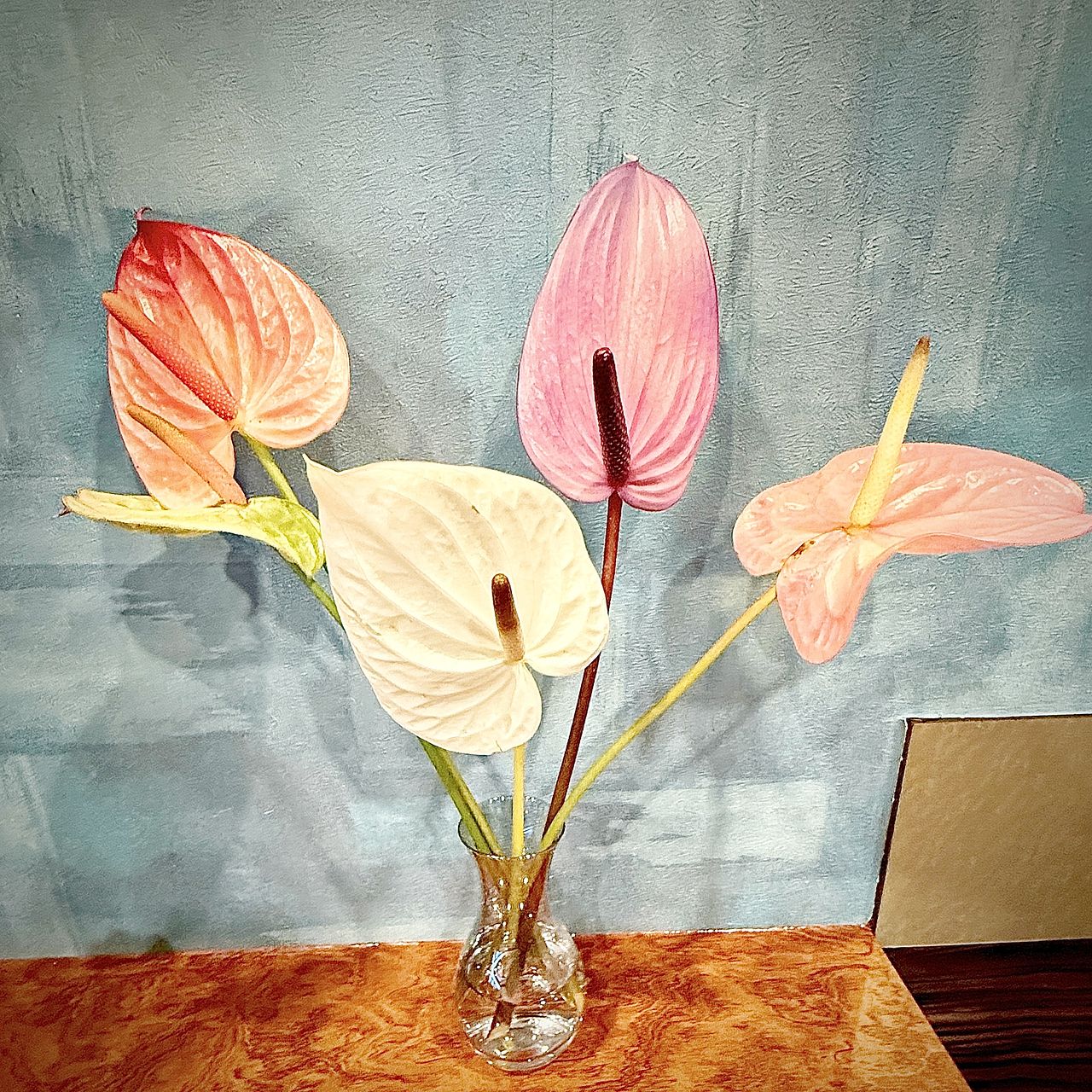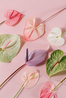 ピンクやホワイト、淡いパープル、グリーンのアンスリウムをミックスで5本届けします💖