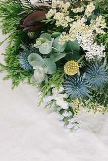ヒバなど深い森の香りが楽しめるグリーンと、エリンジウムなど涼しげな花を合わせました。