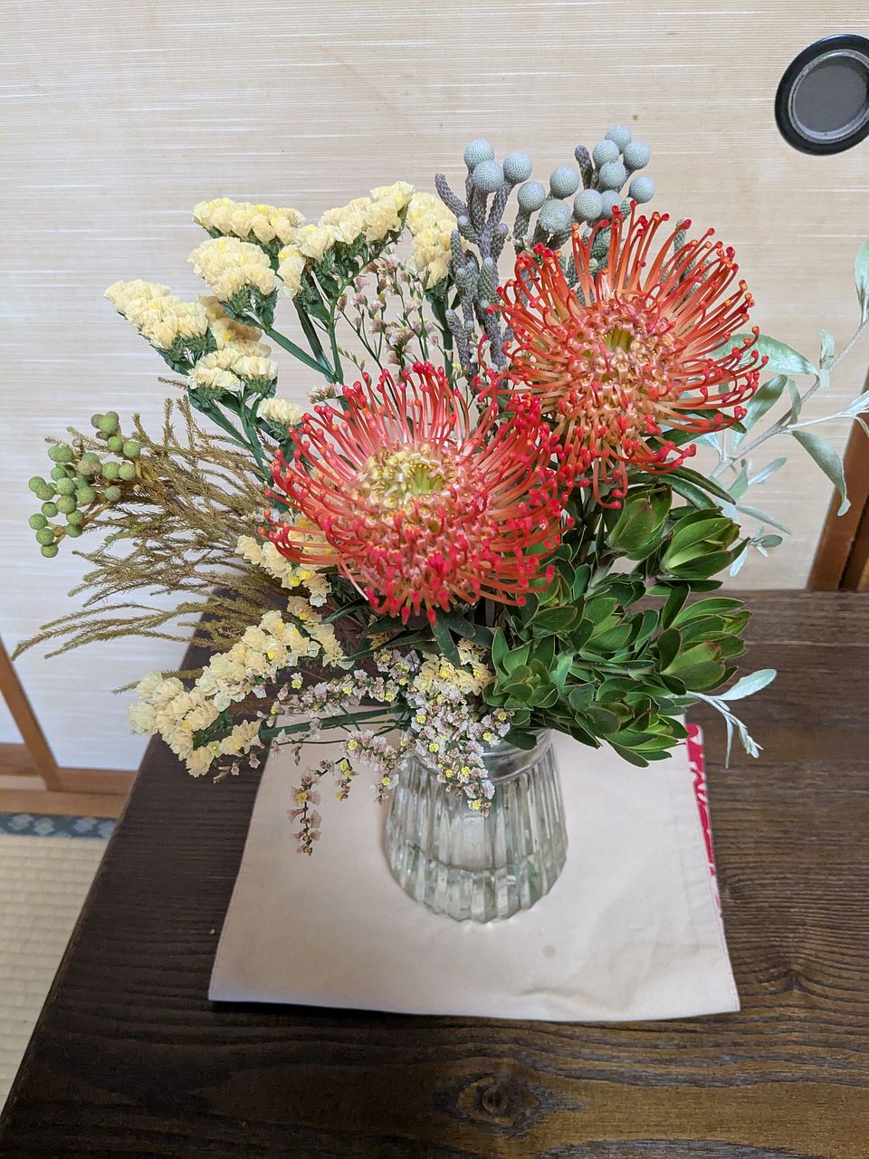 ピンクッションがとても明るく優しい色で、元気を貰えます!一緒に入っていたトゲトゲの蕾の様なグリーンや、葉先が赤い葉物もとても可愛らしくて大正解でした。個人的にはスターチスが苦手なのですが、色味はペールオレンジで綺麗です。 すぐスワッグにするか迷って、結局花瓶に水を入れて生けました。ギリギリまで楽しんで、悪くなる前にドライにしたいと思います。