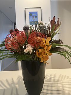 不思議な異国を感じる花束。意外と落ち着いた色味のピンクッションのオレンジと多種花材のシックなグリーンの組合せは、ワイルドだけれど可愛い印象です。直ぐにスワッグにするの難しそうに思えて、届いた今取り敢えず、花瓶に投げ入れてみました。映っていませんが、このほかに2本くすみイエローの花等あり、これは始めからドライで別に飾り後のスワッグ作りで合流待機中(?!) 花材の根元にジェルの水分補給してある状態での冷蔵配達のおかげさまで、とても元気な状態で届きました、ありがとうございます。