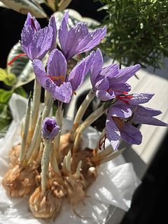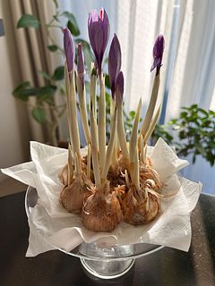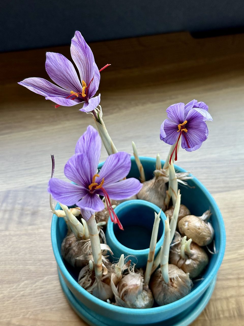 楽しみに待っていたサフラン、咲き始めました! 花脈が透ける薄い花びらが繊細で、黄色緋色の鮮やかな雄蕊雌蕊とのコントラストもとても可愛いです。 はじめに咲いたひとつが他を待たずにすぐに萎れてしまい少しがっかりしたのですが、すぐに同じ球根から次の花が、それに続くように他の球根からも咲き始め、お花ひとつじゃないんだ!ちょっとしたサプライズを貰ったようで嬉しかったです(物を知らないだけですが💦) 萎れてきた花の赤い雌蕊をカットしてドライにしたら、スパイスとして使えるのかしら。。。?