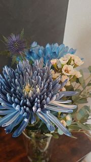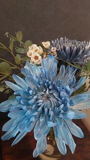 とっても大きなマム2輪届きました! 色は落ち着いたブルーネイビー系で見ていると心が穏やかになります! 同時に売られていたブルーローズとアイシーカラーのカーネーションも購入し、一緒に飾っています!
