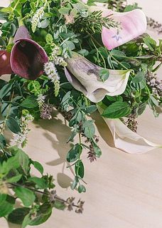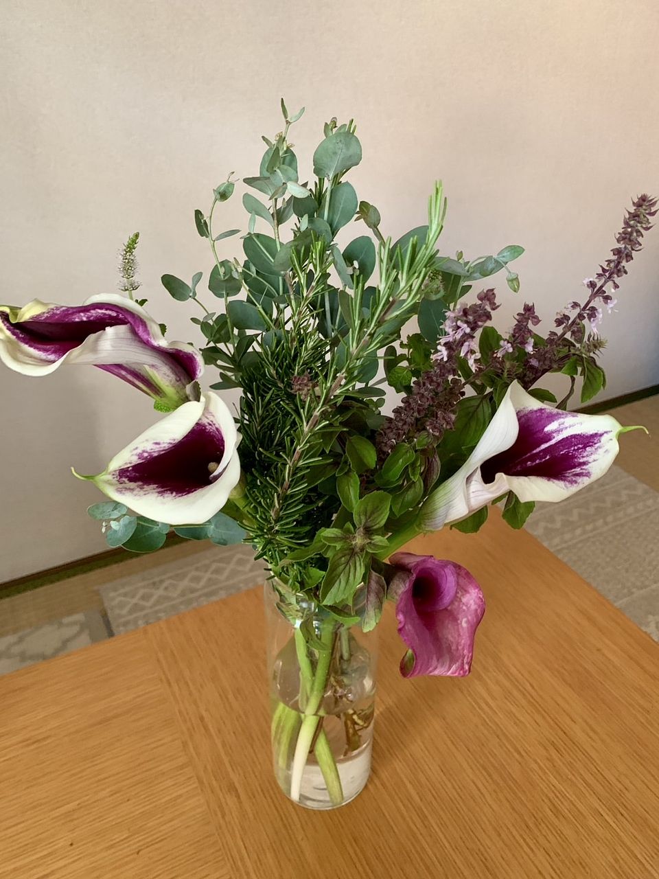 エレガントな印象のカラーに、ミントやローズマリー、バジルなどのフレッシュなハーブを合わせた、心ほどけるブーケ💐瑞々しいグリーンの香りがふわりと広がり、まるでハーブガーデンを散歩しているかのような気持ちに✨