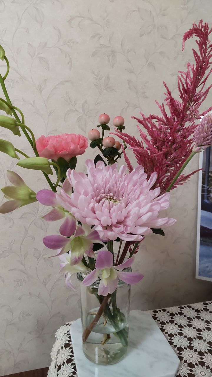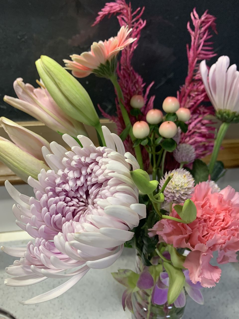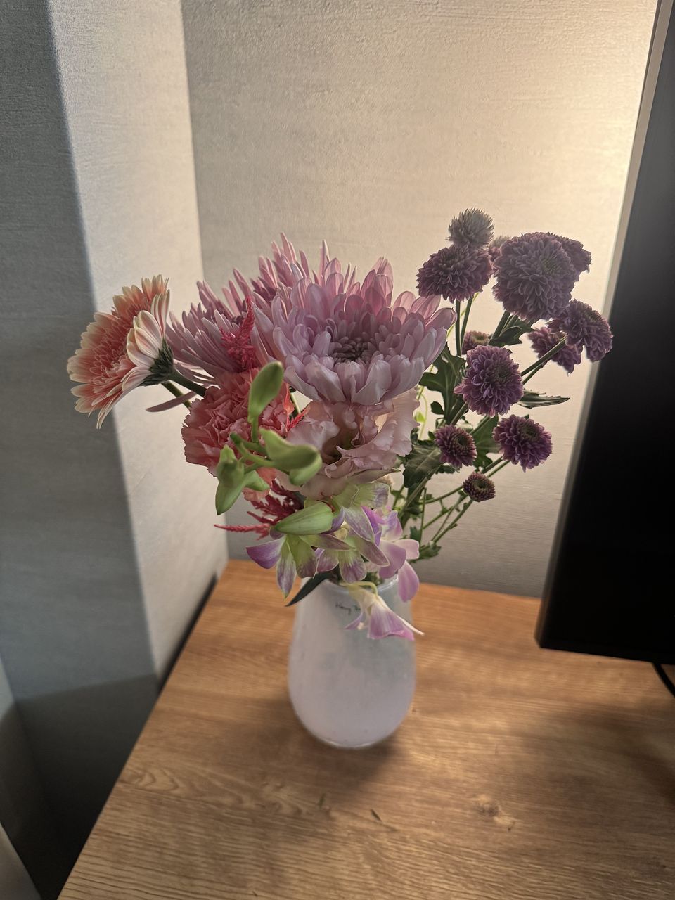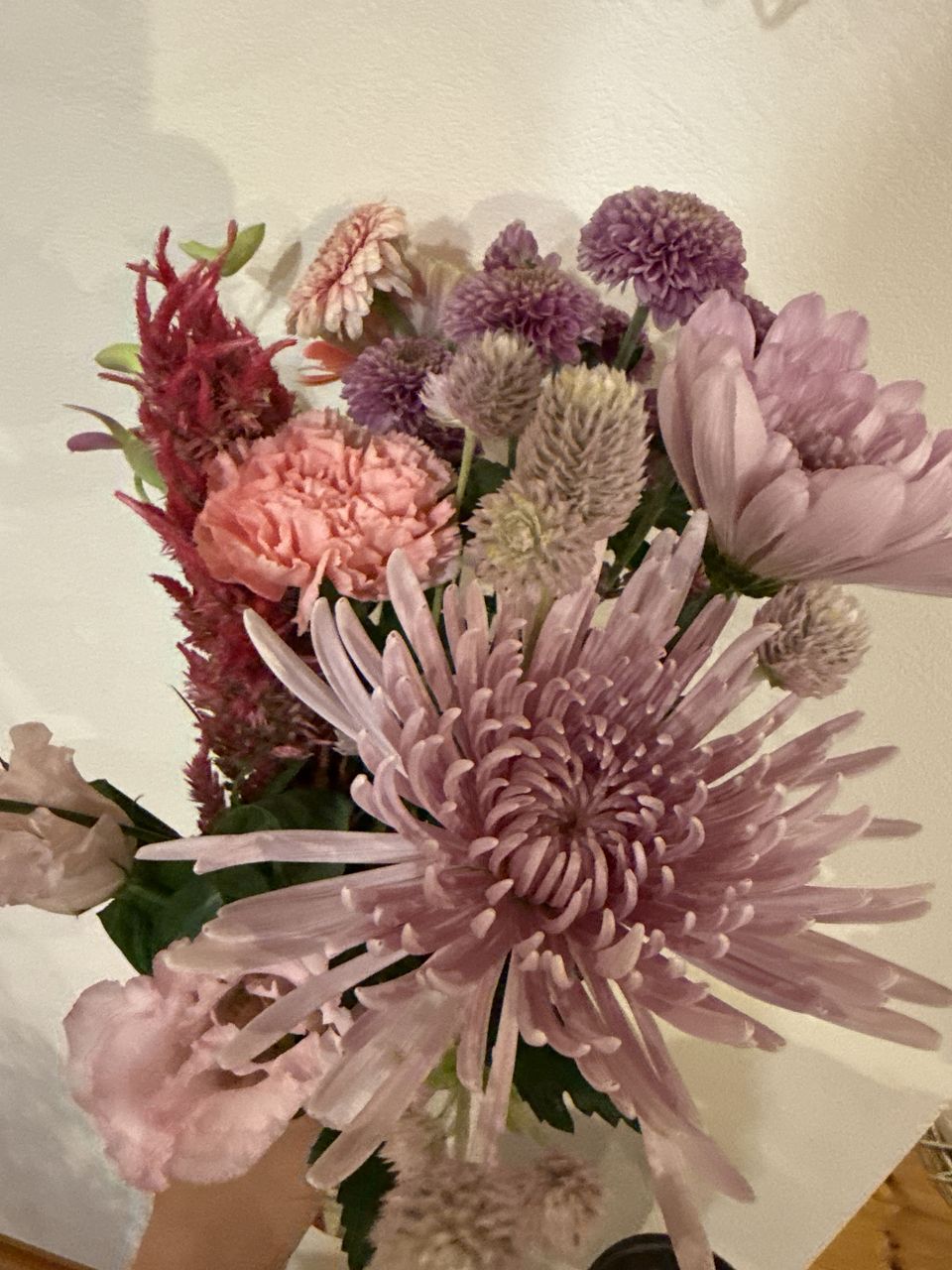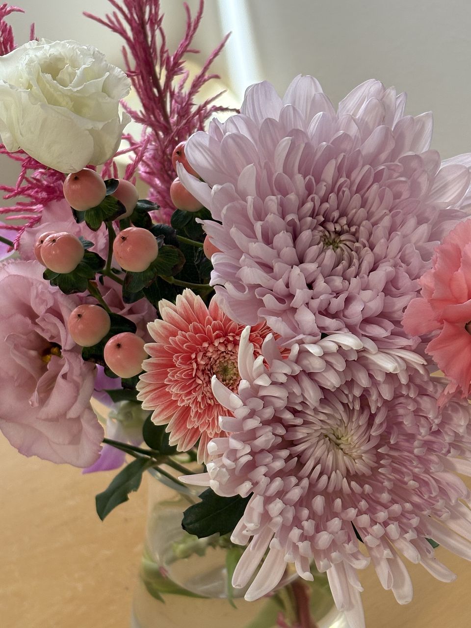 とてもボリューム感ある可愛いお花が届きました。どれも元気です!今回は一つの花瓶に盛りだくさんで飾りました
