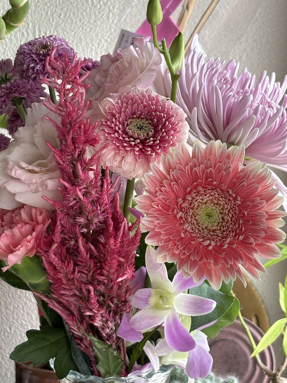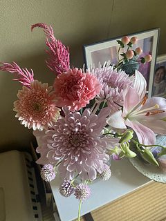 仏前に御供え。お洒落で優しいピンク色で、親戚にも好評です。ありがとうございます。綺麗なお花の前で、温室に勤めていた亡き祖母と、松の剪定を生業としていた祖父を心穏やかに皆で偲ぶ事が出来ました。