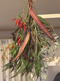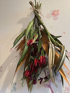 赤いオクラが予想以上に大きくて! 存在感が凄いです😍 グリーンのオクラも混ざっていたら飾った時に更に見応えがあるように思います♪ リバーシブルの葉も素敵💓 すぐにスワッグとして飾ります