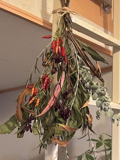 グリーンと赤のオクラと唐辛子のコントラストが、とても素敵です。 届いた日と3週間ちょっと経過した写真です。 ユーカリのいい香りがします♪