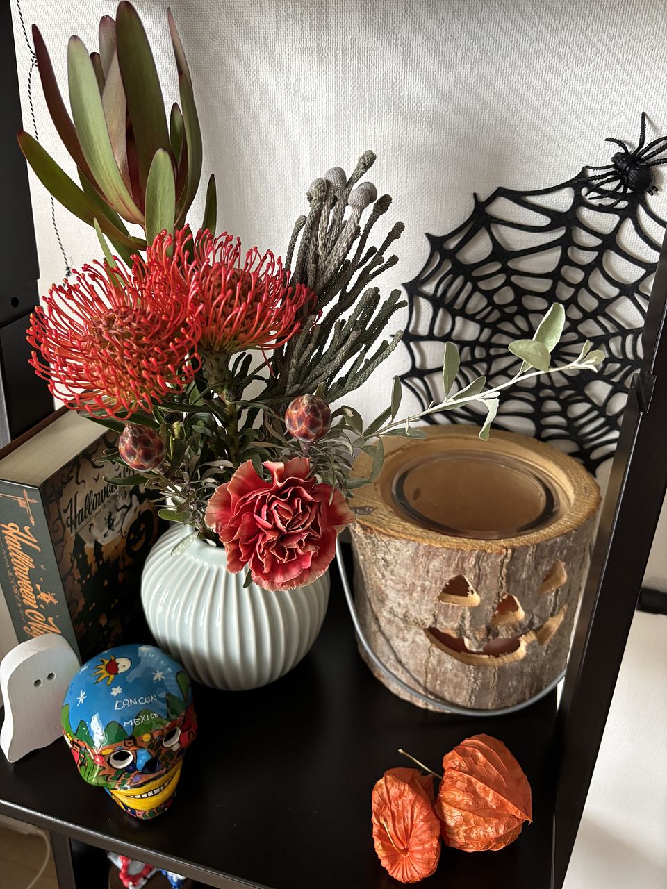素敵な秋色が合わさった花束が届きました。2つに分けて、1つはハロウィンコーナーへ。毎日愛でさせてもらいますね。